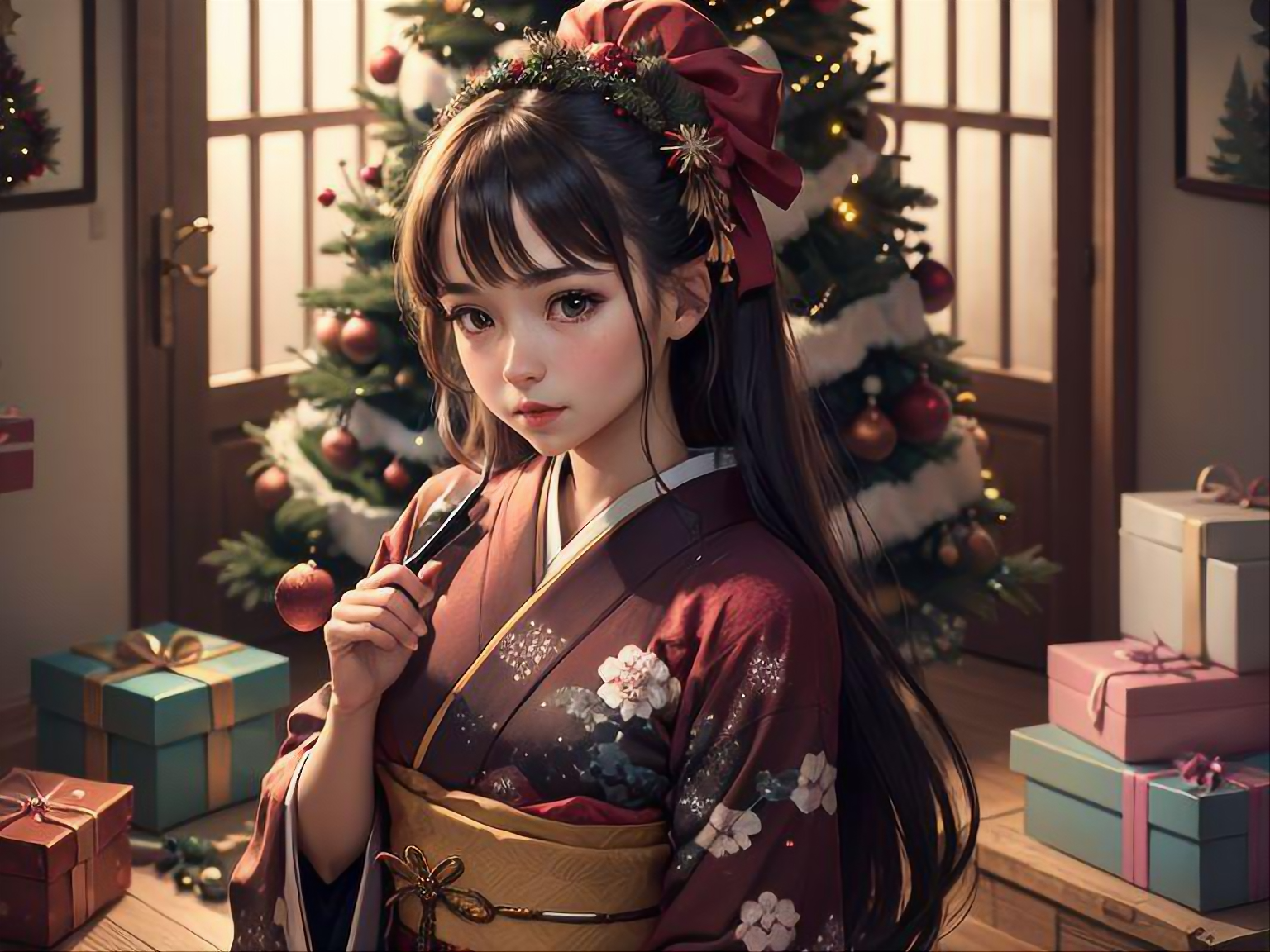 フリー素材、無料写真、クリスマスと着物の女の子