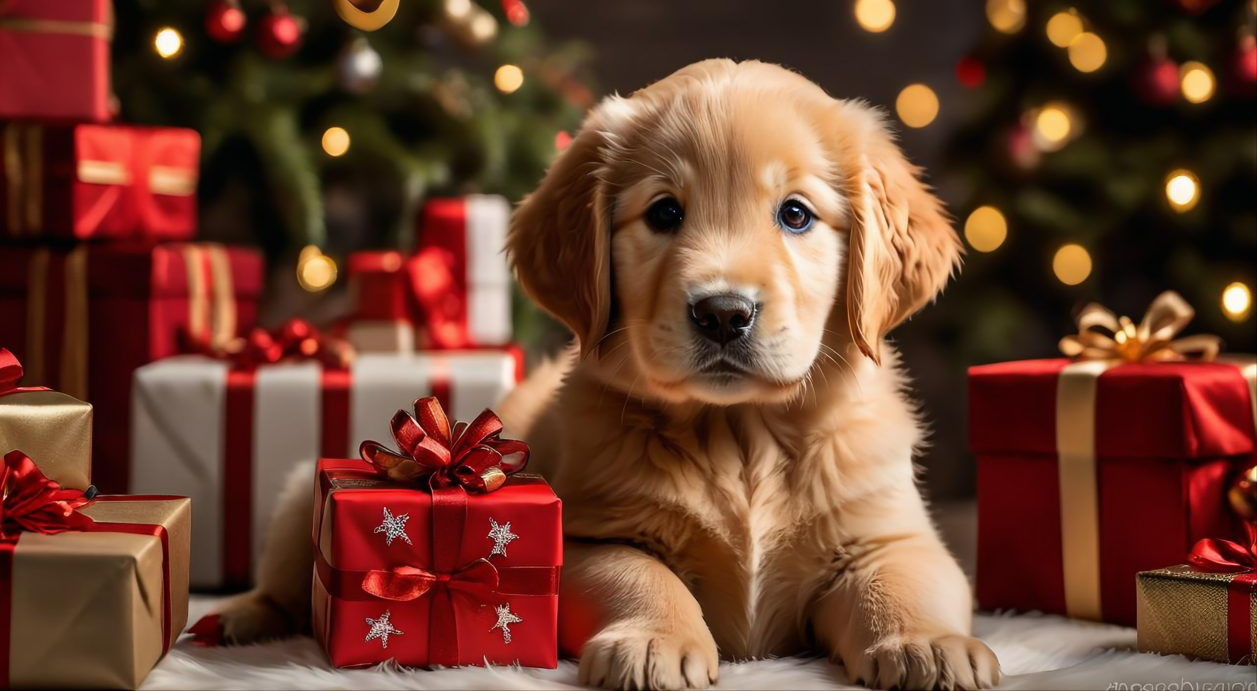 フリー素材、無料写真、ゴールデンレトリバーとたくさんのプレゼント