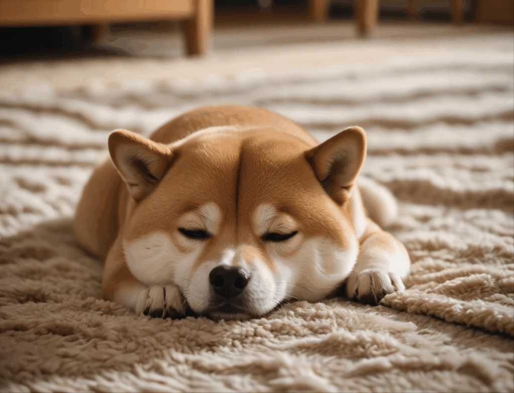 フリー素材、無料写真、ラグに寝そべる柴犬
