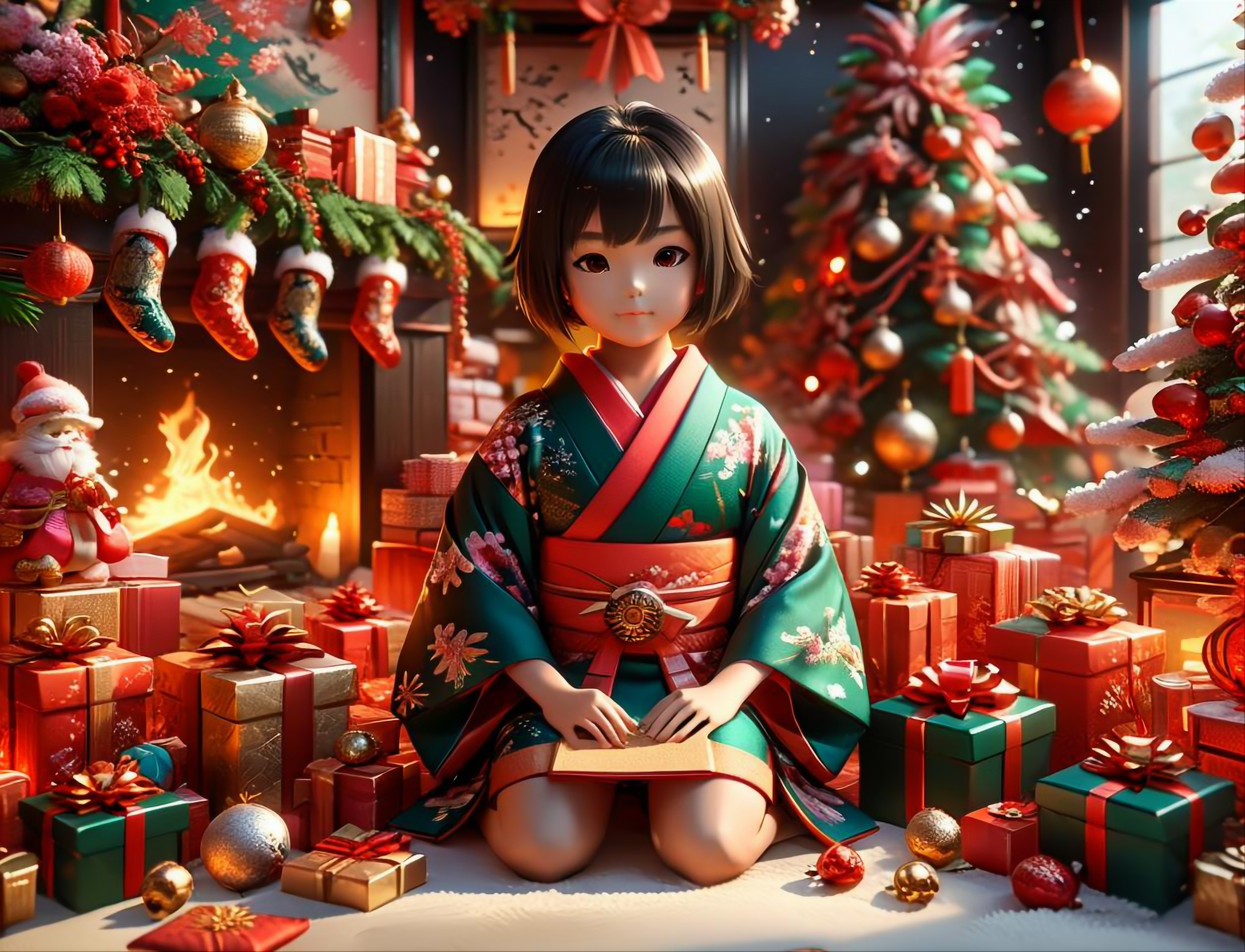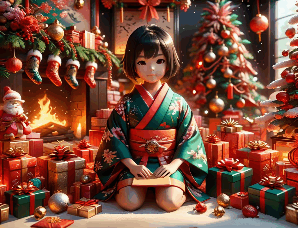 フリー素材、無料写真、着物姿の女の子とクリスマス
