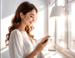 無料写真、スマホを見て微笑む女性