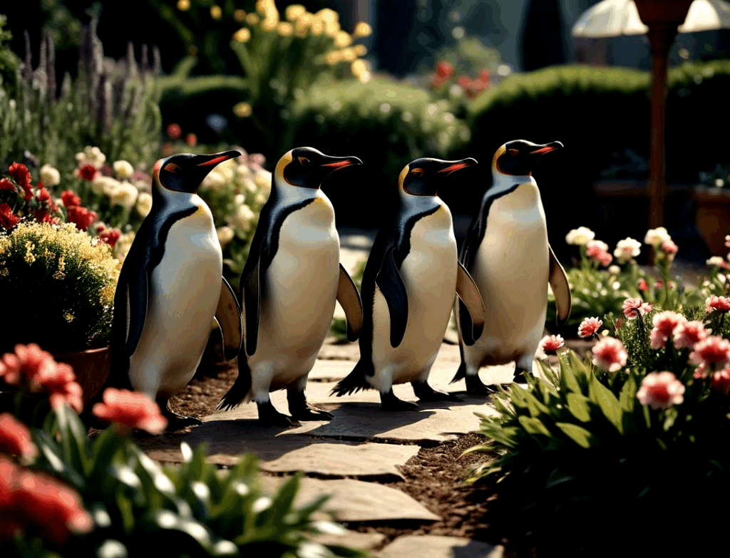 無料写真、庭を並んで歩くペンギン