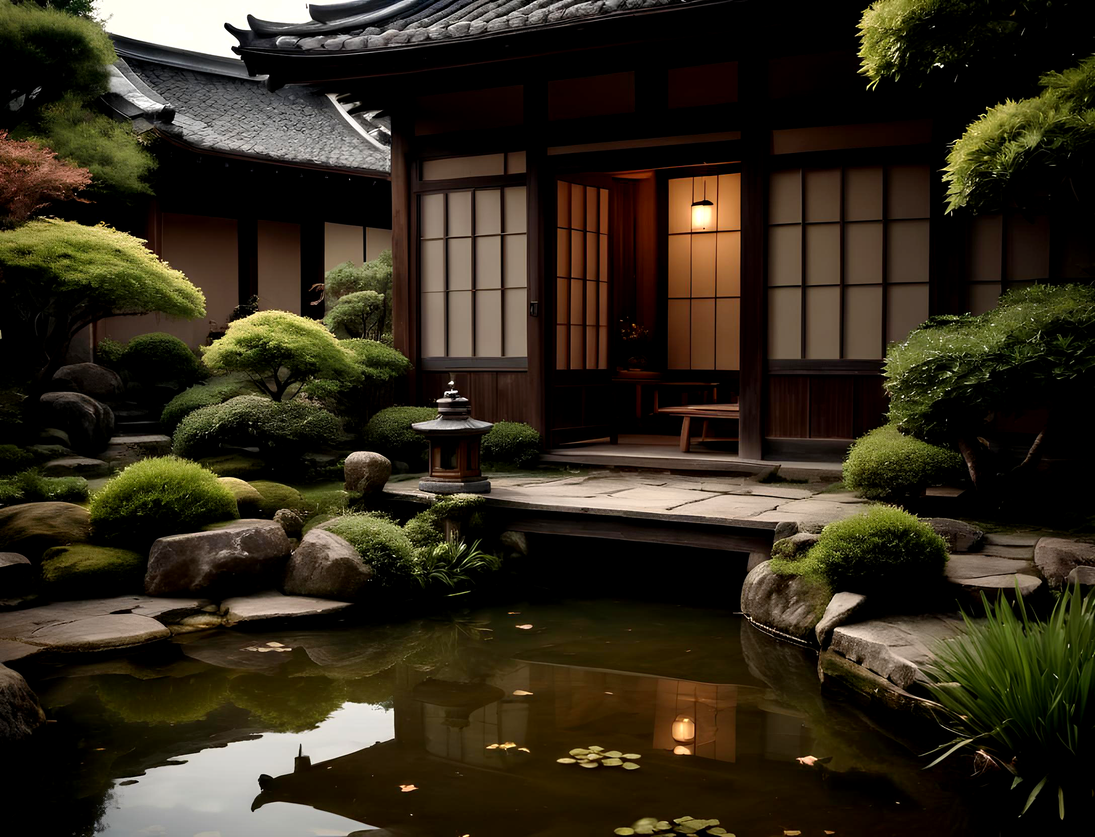 和風建築、一戸建て、家、池のある庭、無料写真、ランキング、商用利用可能、動画利用可能。